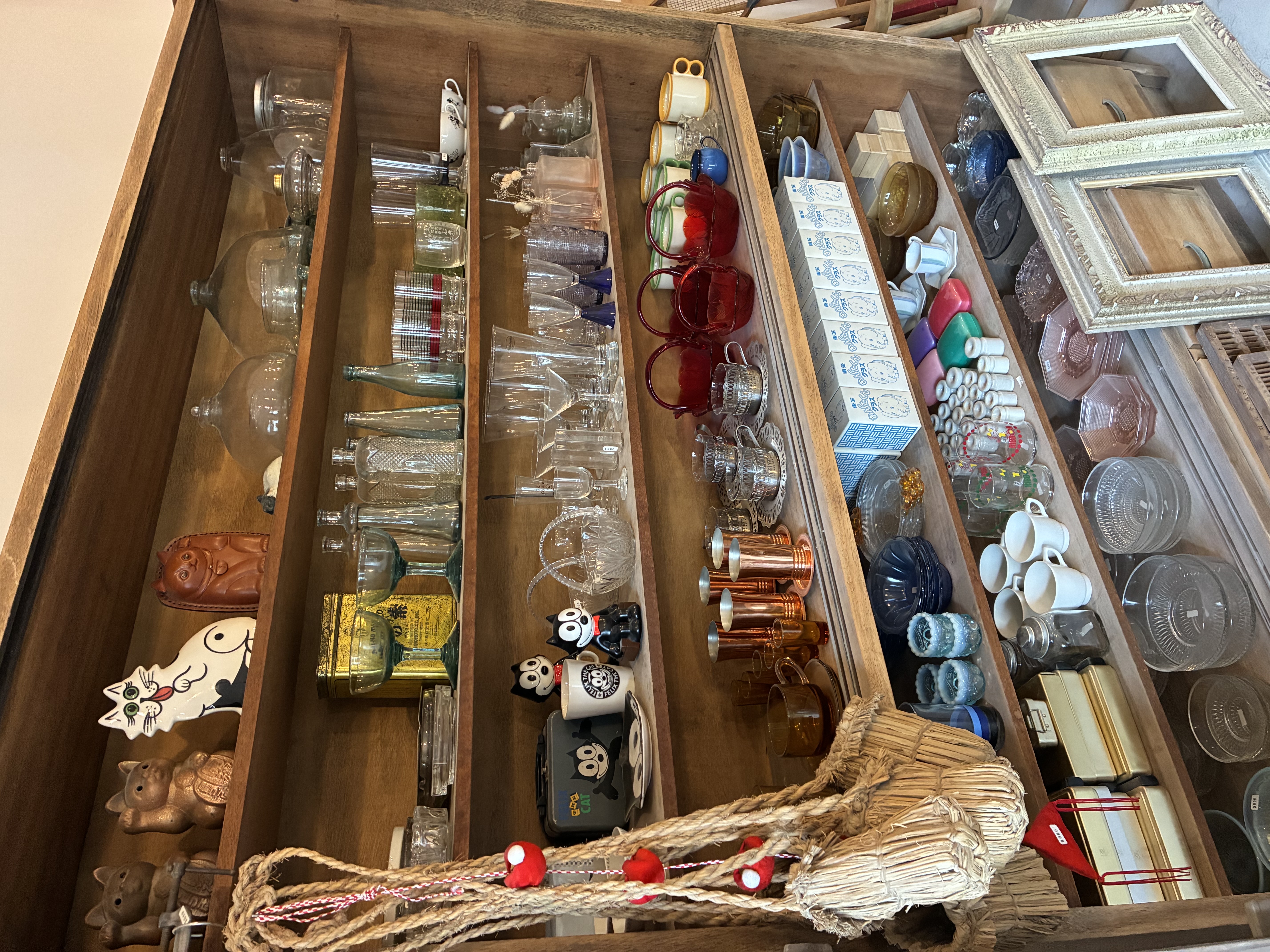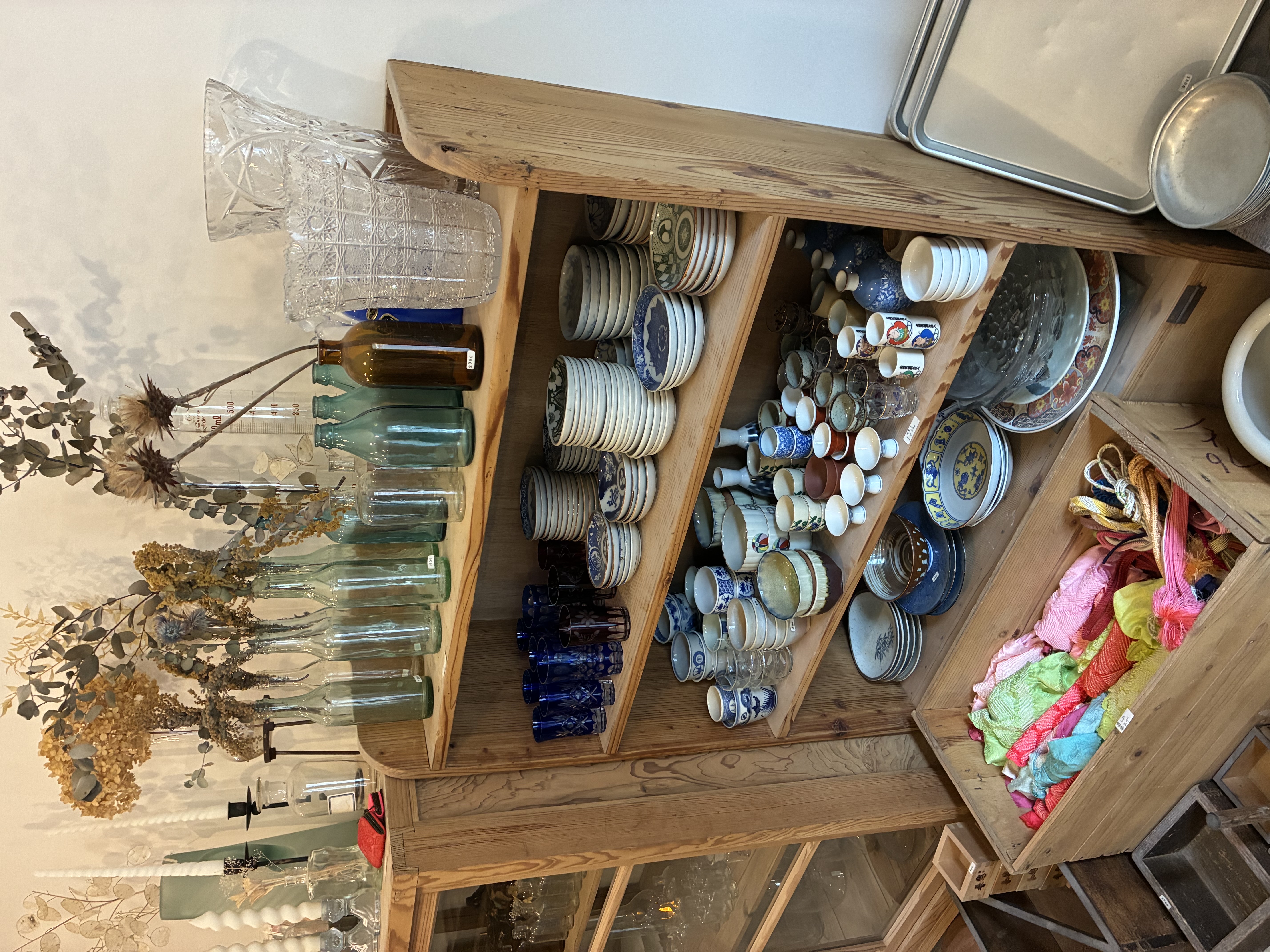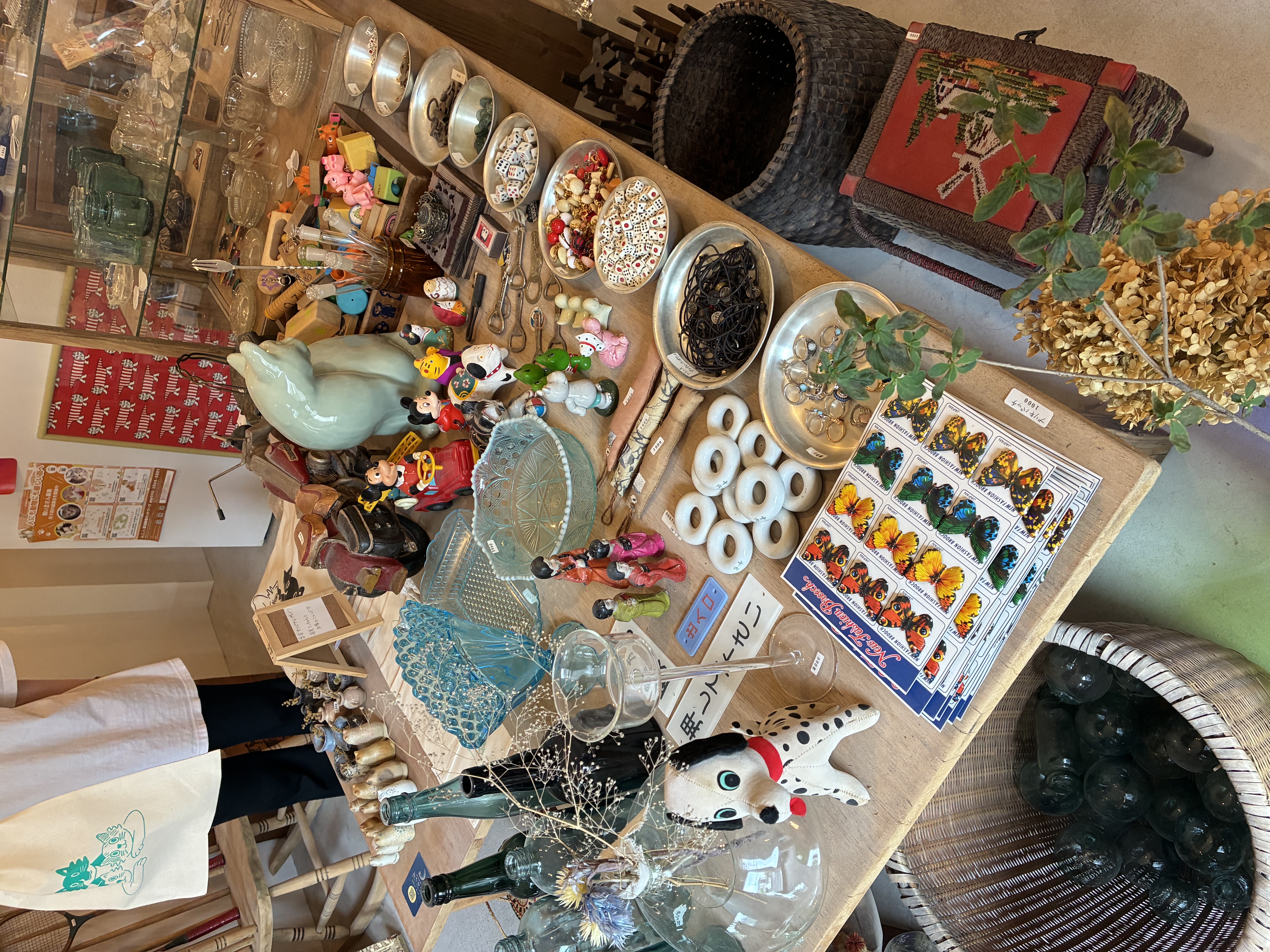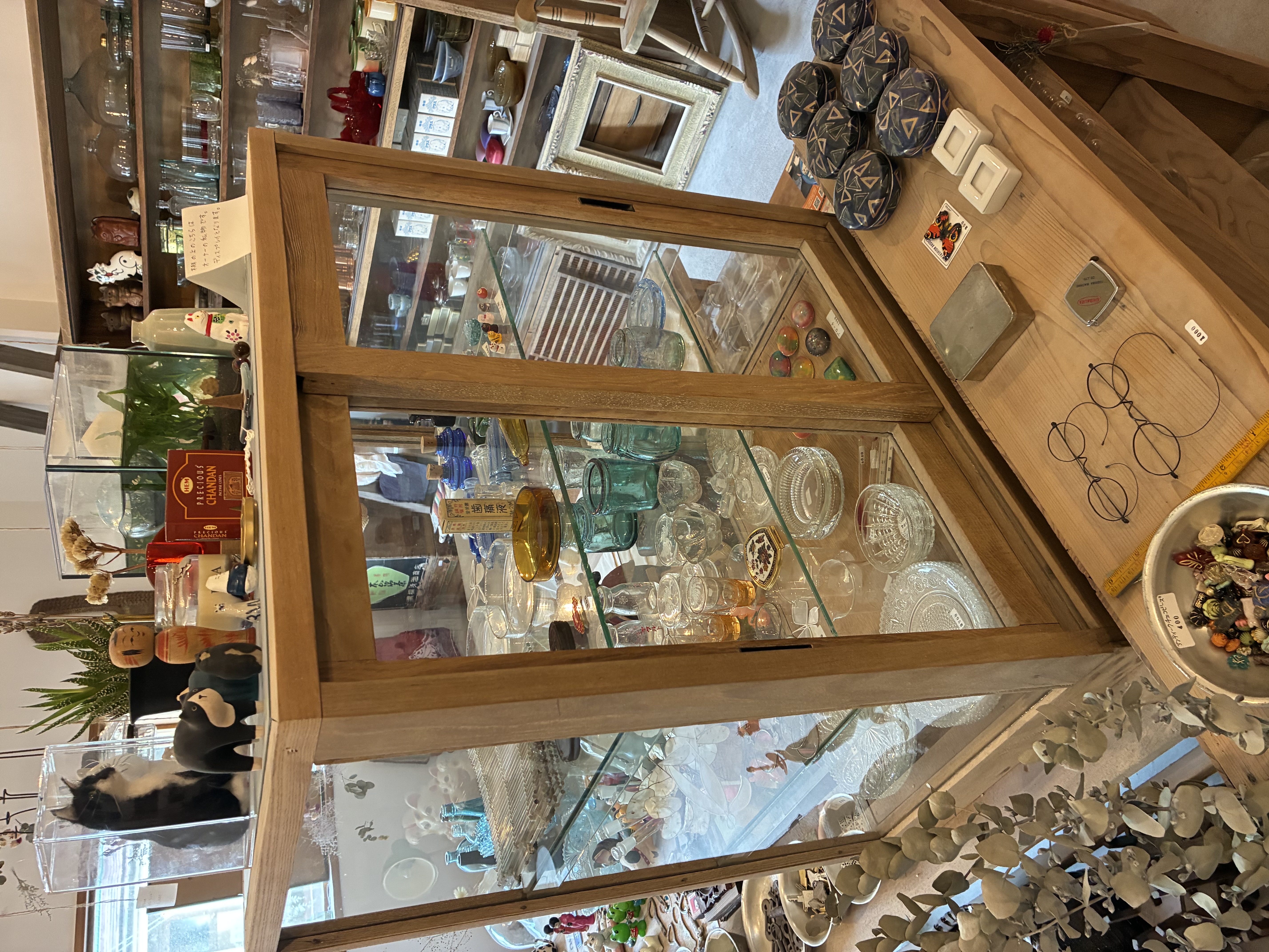 棚には光を受けてきらめく古いガラス瓶や、歴史を感じるレコードジャケット、猫の雑貨などが並びます。置かれているのは骨董品というより、誰かの暮らしの中で長く使われてきた日用品たち。
